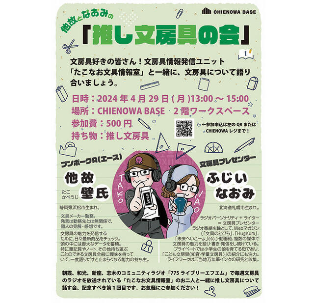 好評放送中のラジオ番組「他故となおみのブンボーグ大作戦!」のパーソナリティを務めている“たこなお文具情報室”の他故壁氏さんとふじいなおみさんのお二人と一緒に、文房具について語り合う「他故となおみの 推し文房具の会」が2024年4/29(月) 13:00~15:00に、埼玉・朝霞市のCHIENOWA BASE(2階ワークスペース)で開催される。参加費は500円(参加申込はこちらから)。