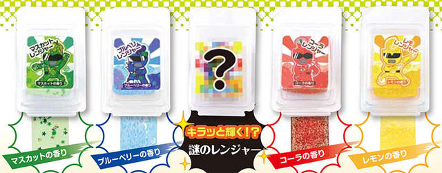 「ドリンク戦隊ゴクレンジャー」のねりけし5種類をラインアップ。マスカットの香り、ブルーベリーの香り、コーラの香り、レモンの香りの4種に加え、開けてみないと分からないシークレットの“なぞ柄”1種を用意した。キラキラ輝くラメ入り。どれも中身が見えない袋(下写真)に入っているので、どのねりけしが当たるのかは、開けてからのお楽しみ。