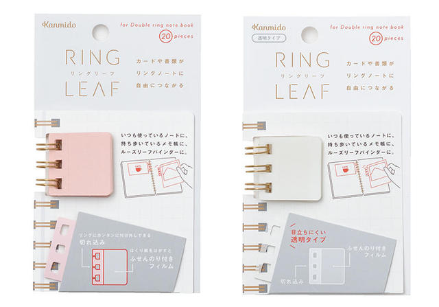 カンミ堂は、カードや書類をダブルリングノートのリングに"つなげて"快適に持てるリングノート向けふせんパーツ「リングリーフ」の新色として、キュートな「モモイロ」と、セットするものやノートの紙面になじむシンプルな「トウメイ」を2020年7月29日に発売する。税抜350円。
