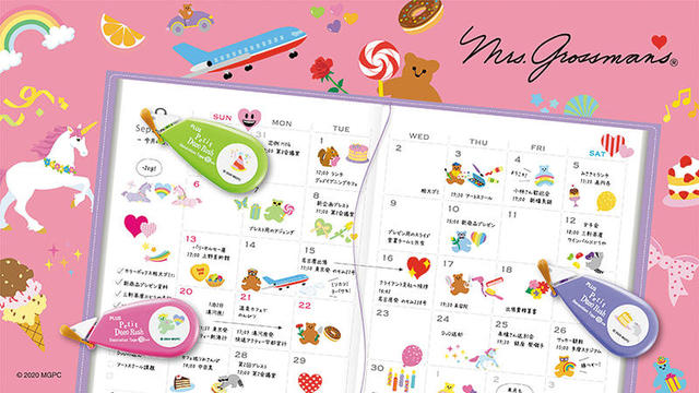 プラスは、毎日の手帳を自分らしくアレンジするのに便利なデコレーションテープ「プチデコラッシュ」太幅タイプから、キュートなモチーフが人気の米国ステッカーブランドMrs. Grossman’s(ミセス・グロスマン)とコラボした〈限定〉「Mrs.Grossman’s デザイン」を2020年8月25日に発売する。全7柄、各税抜300円。