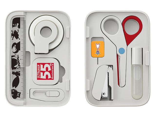各アイテムは、コラボならではの特別仕様になっている。はさみは、カラータイマーのブルーが目を引くウルトラマンカラー。またSIMカード交換用ピンには、「科学特捜隊」のオレンジカラーに流星マークを印字。さらに、定規には「怪獣」のシルエットをあしらい、メジャーにはウルトラマン55周年記念ロゴを印字している。