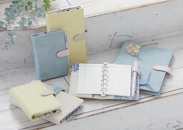 今回のカバーは、淡色やくすみカラーを取り入れた3色展開(ブルー、ベージュ、イエロー)で、表面のシボや内側の植物柄は色ごとに異なるデザイン。さらに、カバーと異なるベルトカラーで、遊び心のあるカジュアル系システム手帳となっている。リフィルは、便利なサイドリスト付きのマンスリーブロックタイプ。用途に合わせて選べる3サイズ展開。A5サイズ税込6,050円、バイブルサイズ(写真)同4,840円、ポケットサイズ同4,070円。