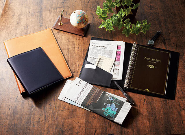 「ビジネススリムバインダー」は、背が丸くスリムタイプでビジネスバッグに収まり、商談や打ち合わせの際にノートと一緒に書類を持ち運べる。素材は上品で高級感のある合成皮革で、金属リングの多穴ノート付きバインダーとなっている。クリアホルダー収納対応サイズなので、ノートなど普段使い以外にも、店舗などでのメニューブックやフォトブックなど様々なシーンで活躍。