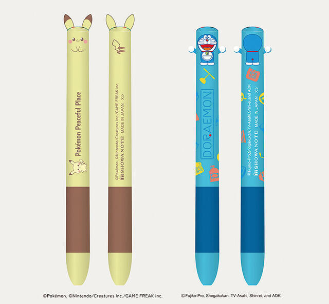 ショウワノートは、「ポケピース」ピカチュウと「ドラえもん」の「mimi ペン」を2025年1月から新発売する。各税込770円。