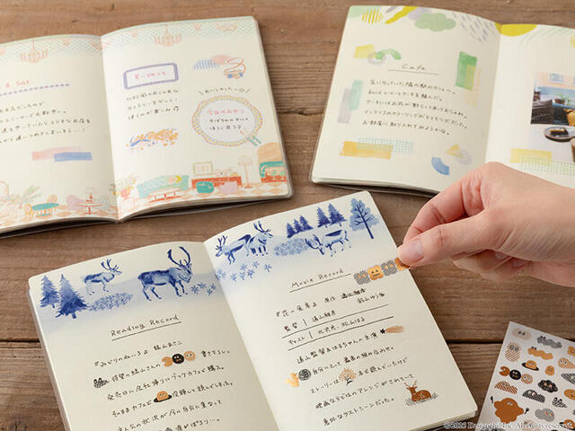 「水性ペンで書けるシール」(右写真)は、表面の特殊加工により、水性ペンで文字を書き込むことができるシール。同じ柄の「ドット方眼のノート」と一緒に使うとまとまりのあるページになるため、初めてのノートデコレーションにもぴったり。青い北欧柄/旅とホテル柄/モチーフテキスタイル柄の3柄で、同572円。