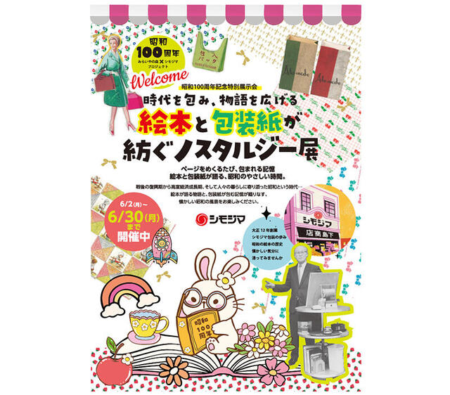 シモジマは、未来屋書店 川口店内の児童書コーナー「みらいやの森」で実施されている月替わりギャラリーの6月企画として、絵本と包装紙の歴史をテーマにしたギャラリー「時代を包み、物語を広げる 絵本と包装紙が紡ぐノスタルジー展」を、2025年6月2日(月)から6月30日(月)まで開催している(最終日のみ16時まで)。入場は無料。