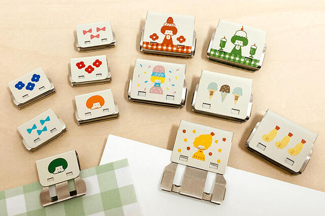 白地のスライドクリップに、mizutamaさんの可愛いイラストをプリント。Sサイズ(ぽかぽか、そよかぜ)はコピー用紙30枚、Lサイズ(喫茶、アイスクリーム、エビフライ&海老天)はコピー用紙60枚に対応。事務用途としてはもちろん、手帳デコに使う紙ものの整理、封筒やお菓子の袋止めなどにも使える。