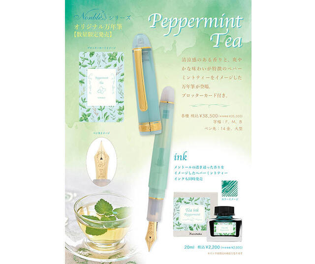 万年筆は、プラチナ万年筆の「#3776 センチュリー」をベースに、清涼感あふれる香りと、爽やかな味わいが特徴のペパーミントティーをイメージしたデザイン。カラーリングは透明感のあるブルーグリーンでまとめた。ペン先は14金大型でゴールドメッキ仕様。字幅はF、M、Bの3種類。価格は税込38,500円。