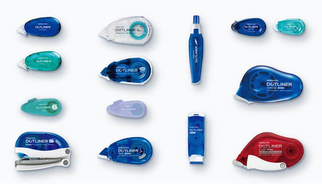 テープのり「ドットライナー」は、2005年6月に誕生した日本初のドットパターンのテープのり。従来のテープのりに見られた塗りムラや、のりがスムーズに切れないといった不満を解消するため、のりを「ドット(=点)」に塗布する新開発の塗工技術を導入。これにより、のりの切れがよく、スムーズな貼り付けを実現した。