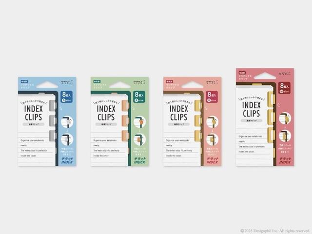 デザインフィルは、同社が展開するプロダクトブランド「ミドリ」より、手帳のカバーからはみ出ない金属製のインデックスクリップ「チラットインデックスクリップ<S>」(シルバー/オレンジ/真鍮…計3種類、各税込748円)と発売中の「チラットインデックスクリップ」に新素材(真鍮、同770円)を追加し、2025年7月10日に発売した。