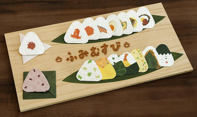 「ふみむすび」は、おむすび型のメッセージカードに、封筒とシールがセットになった商品。おむすびの“味”が描かれたカードにメッセージを書き、おむすびのパッケージを模した封筒に入れて渡す。メッセージカードを贈る側には「あの人はどんな味が好きだろう?」と考えながら選ぶ楽しみを味わってもらい、受け取る側には「なに味のおむすびだろう?」と開ける楽しみを味わっていただけるよう、計16種類を展開。