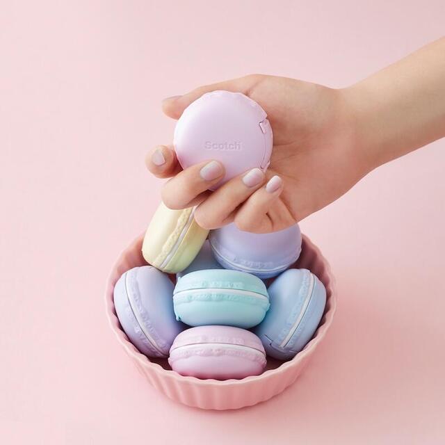マカロンの形をしたテープディスペンサーはパステルカラーの5色展開で、近くにあるだけで気分が上がる魅力的なデザイン。