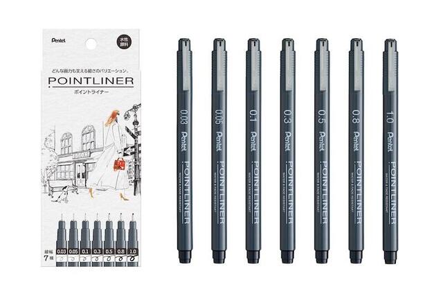 「ポイントライナー」は、細く均一な線が描ける、耐水性・耐光性に優れた水性顔料インキを搭載したマーカー。一般的に「ミリペン」と呼ばれる製品で、2020年に先行して海外で発売を開始して以来、欧州を中心に高い評価を得ている。特にカスレにくく、用紙を問わず安定して描ける使い心地の良さが好評。