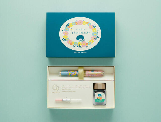 mizutamaさんとアンコーラが再びコラボレーション。今回は、万年筆、インク、コンバーターがセットになった限定セット。アンコーラといえば「お花」というイメージを持っているというmizutamaさんが、同企画のために描き下ろしたイラストのテーマは「お花畑」。「プロフェッショナルギア スリム 万年筆 ohanabatake」」は、ピンク×グリーンの本体にイエロー、ピンク、グリーンのお花がちりばめられ、女の子、ウサギも描かれたmizutamaワールド全開の1本。ゴールドラメ入りのクリア蓋栓、その飾り部分にはゴールド箔のてんとう虫をデザイン。滑らかな書き味の14Kのペン先には、リボンの刻印入り。字幅はF(細字)/ MF(中細字) / M(中字)の3種を用意した。
