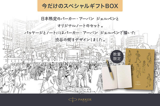 同ギフトパックは、イラストレーターのエイドリアン・ホーガン氏による描き下ろしパッケージデザインを採用。渋谷の風景や日常を独自の視点で描いたイラストを配し、ギフトシーズンに向けた特別感のある仕上がりとなっている。さらに、同氏デザインのB6サイズノートもセットになっています。すべてのイラストは、「パーカー・アーバン」ジェルペンで描かれている。