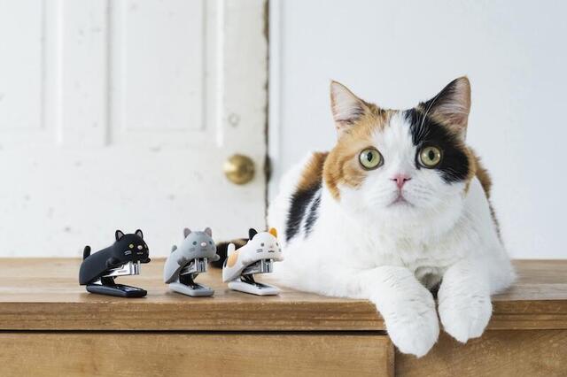 「シリコンカバーホッチキス“ねこ”」は、スタンダードホッチキスにシリコン雑貨ブランドp+g design(ピージーデザイン)がデザイン監修したオリジナルデザインのカバーを装着したアイテム。「くろねこ」、「さばとら」、「みけねこ」の3種類を展開する。かわいらしい表情をした3種類のねこは、前足に肉球のデザインを取り入れるなど細部にもこだわって仕上げた。