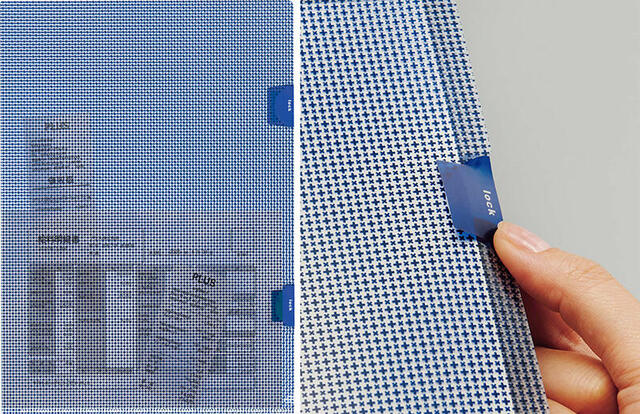 そこで、書類のサイズに関わらず安心して使えるよう、カモフラージュ柄をホルダーの端まで広げた全面印刷にした。また、収納した書類の落下を防ぐロック機能を新たに搭載。ホルダー開口部の上下2カ所が開かないようにロックできる仕組みで、A4サイズの用紙だけでなく、小さな書類も安心して持ち運べる。色分け管理がしやすいブルー、グリーン、レッドの3色のカラー展開。
