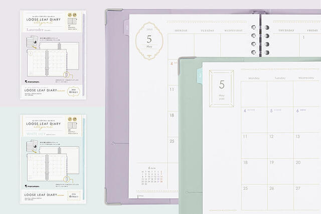 「ルーズリーフダイアリーエレガント」は、花をテーマにした上品なカラーで罫線には装飾が施されている特別感のあるルーズリーフダイアリー。見たいページをすぐ開ける、丈夫なラミネート加工のインデックス付き。各月の裏は見開きメモページで、ルーズリーフや資料を追加して月毎の記録も可能。ホワイトリリーとラベンダーの2色をラインアップ。A5サイズで、同1,650円。